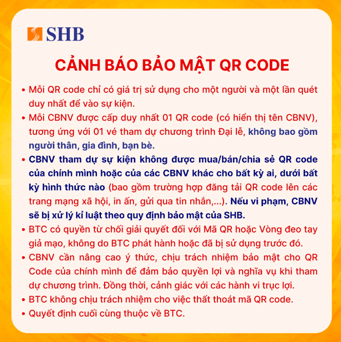 - CBNV tham dự sự kiện không được mua/bán/chia sẻ QR code của chính mình hoặc của các CBNV khác cho bất kỳ ai, dưới bất kỳ hình thức nào (bao gồm trường hợp đăng tải QR code lên các trang mạng xã hội, in ấn, gửi qua tin nhắn,...). Nếu vi phạm, CBNV sẽ bị xử lý kỉ luật theo quy định bảo mật của SHB.